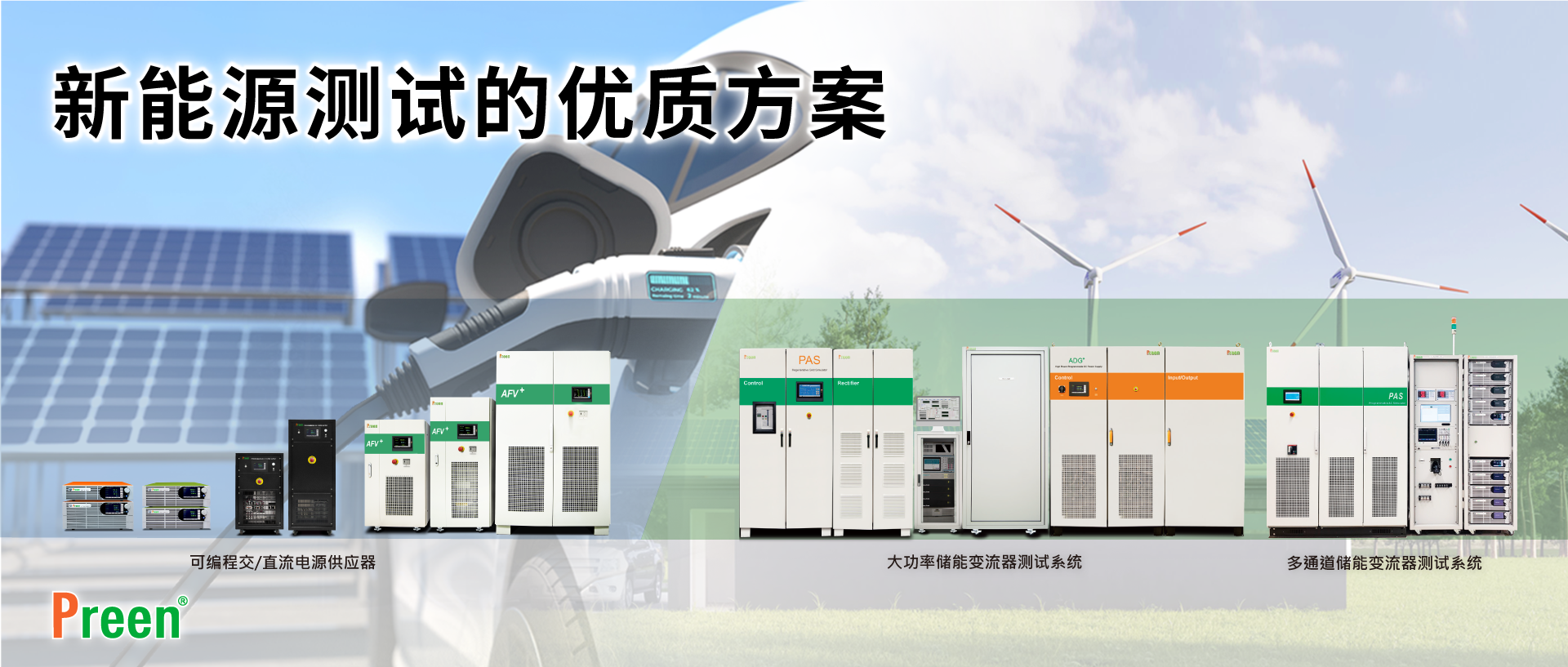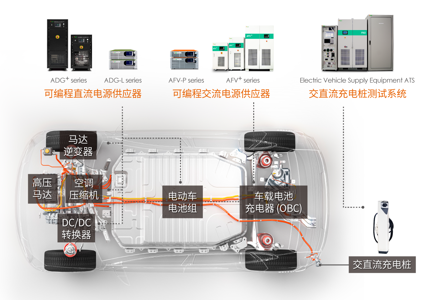 我們擁有市場上較完整的電源產品系列,其中AFV-P、AFV+AFV系列可編程交流電源能夠透過編程功能設定參數組合,測試產品耐久度與多種電源擾動組合,以驗證不同型式的車載式電池充電器。另外,ADG-L、ADG+、ADG-B可編程直流電源能夠有效支持DC/DC轉換器的高壓和低壓測試,并能模擬電池快速充電/放電以及各種情況下的電池特性,以利電動車符合充電架構。