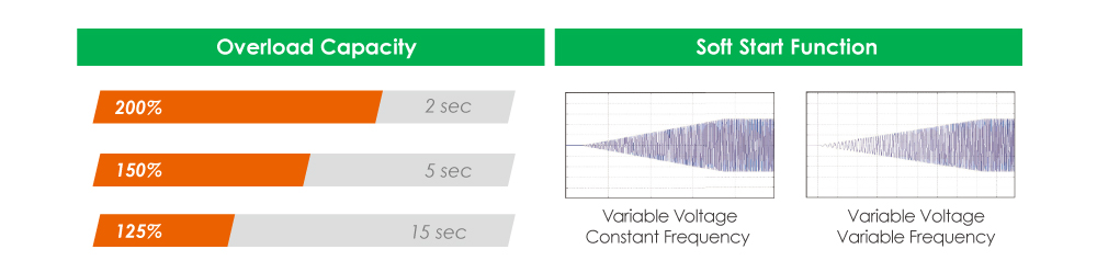 AFV可承受高達125%、150%、200%的電流過載;且透過軟啟動功能,能有效抑制開機時的高啟動電流,此功能適用于馬達、壓縮機等電機類產品,提供可靠的效能,達到長久的機器壽命。